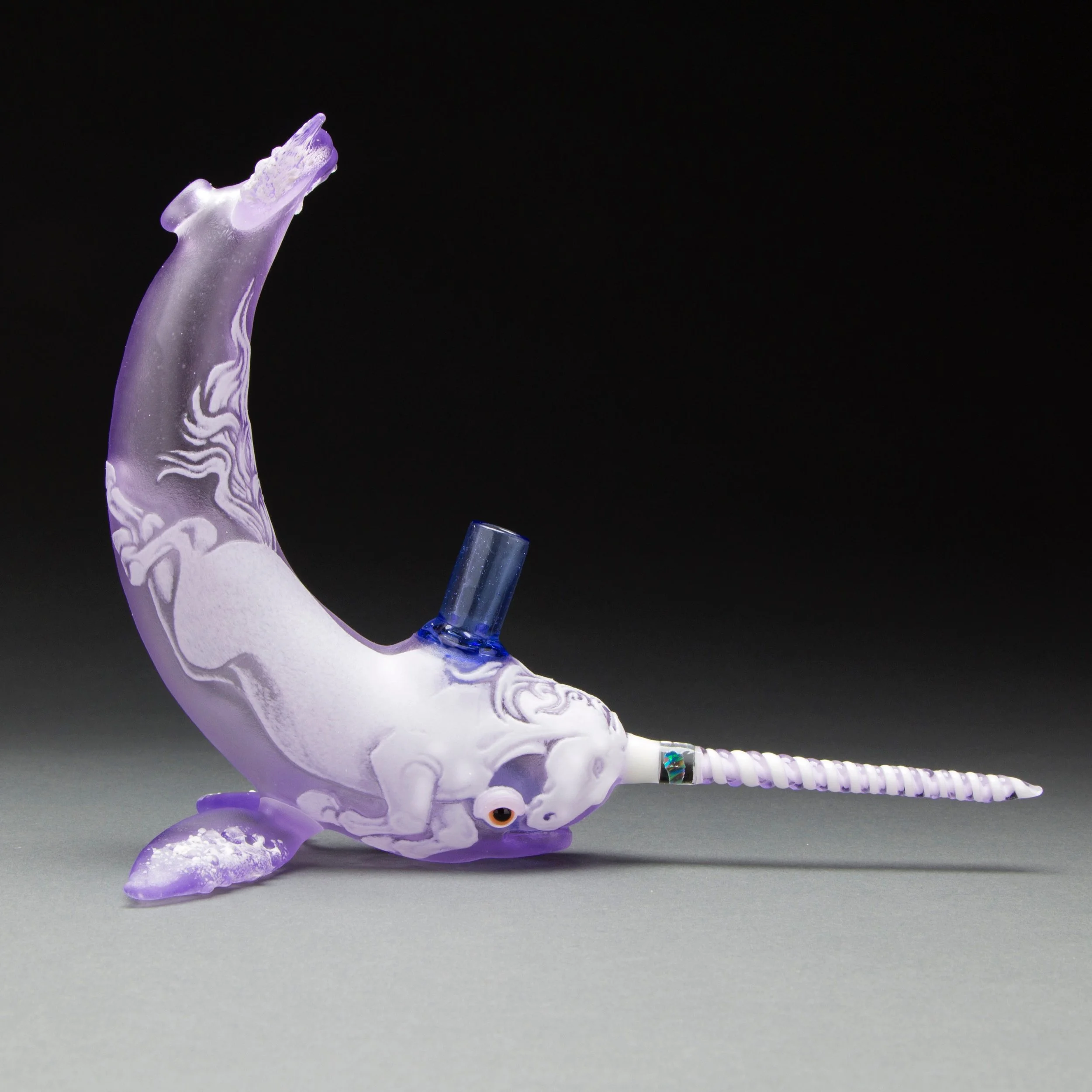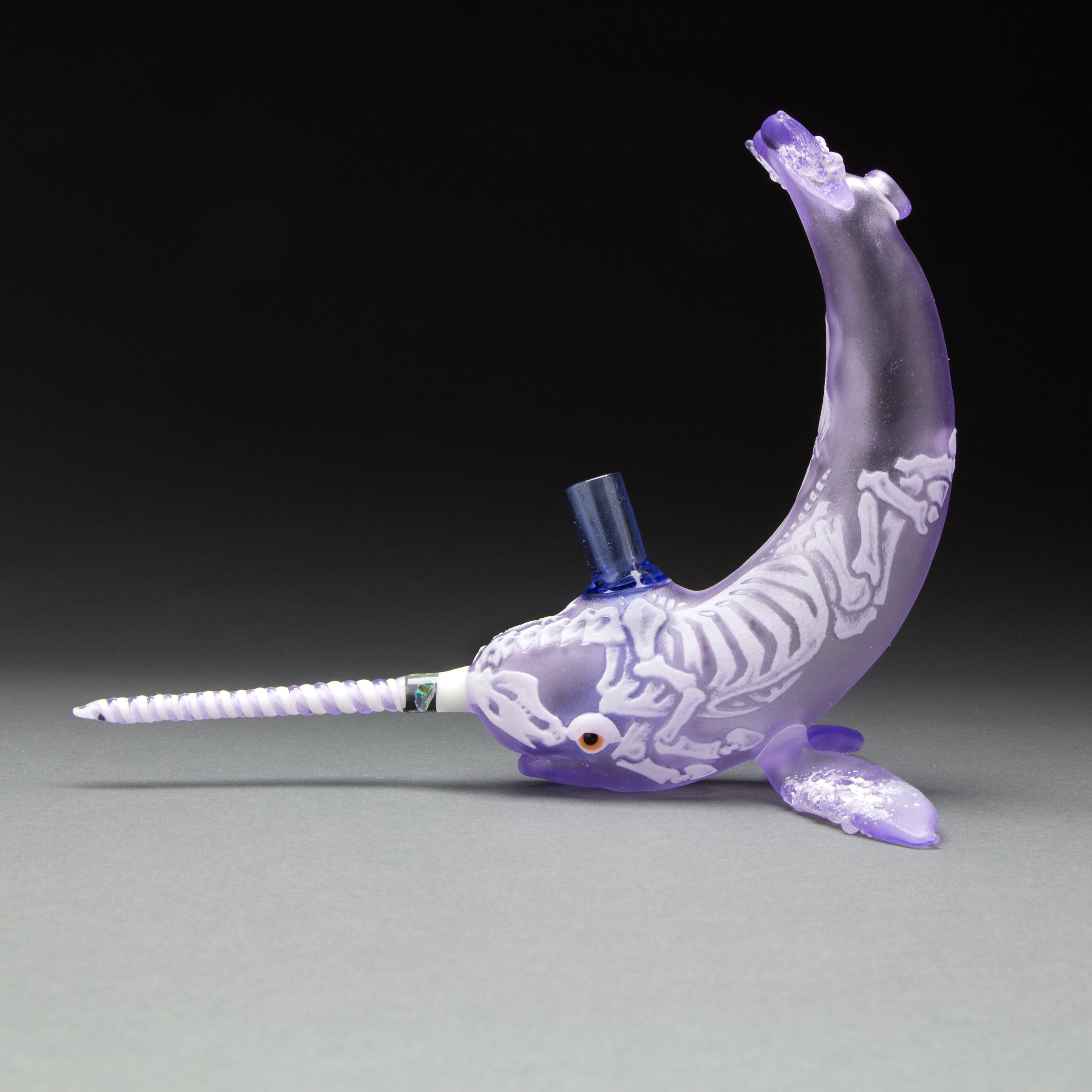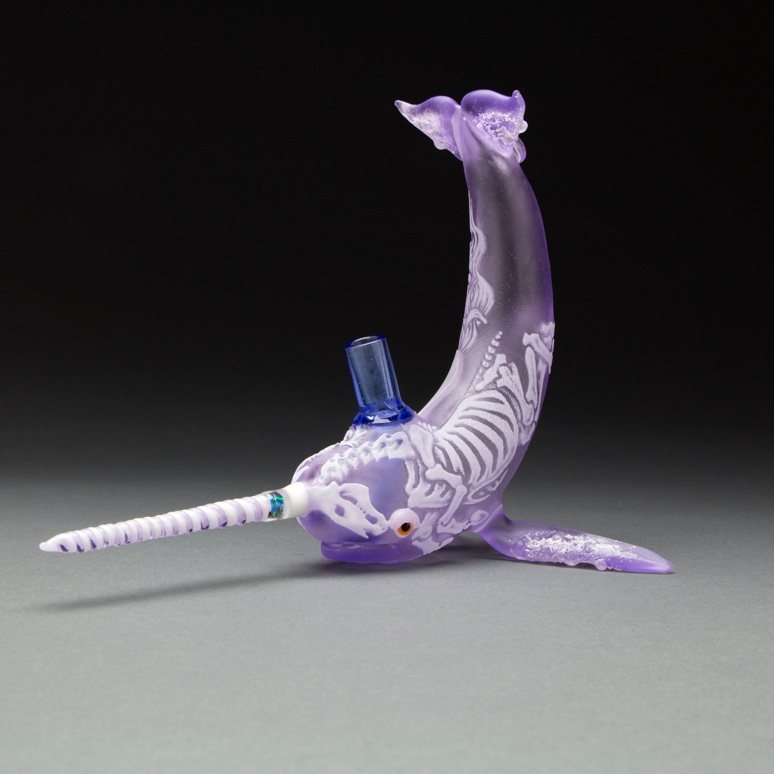 This piece was made in collaboration with Chadd Lacy. DiSalvo carved a unicorn on the exterior of one of the sides of the narwhal, and the unicorn’s skeleton on the other side. Both unicorns share their horn with the narwhal, and there is an encased opal in the base of the horn.